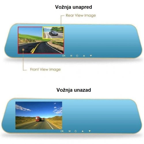 - ✅ Dual kamera sistem – Prednja ugrađena u retrovizor + zadnja kamera sa kablom od 5m