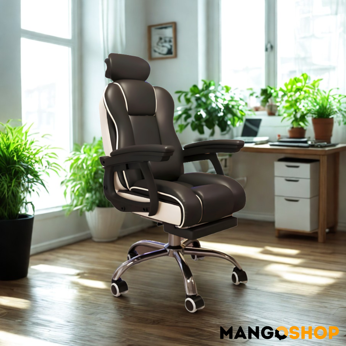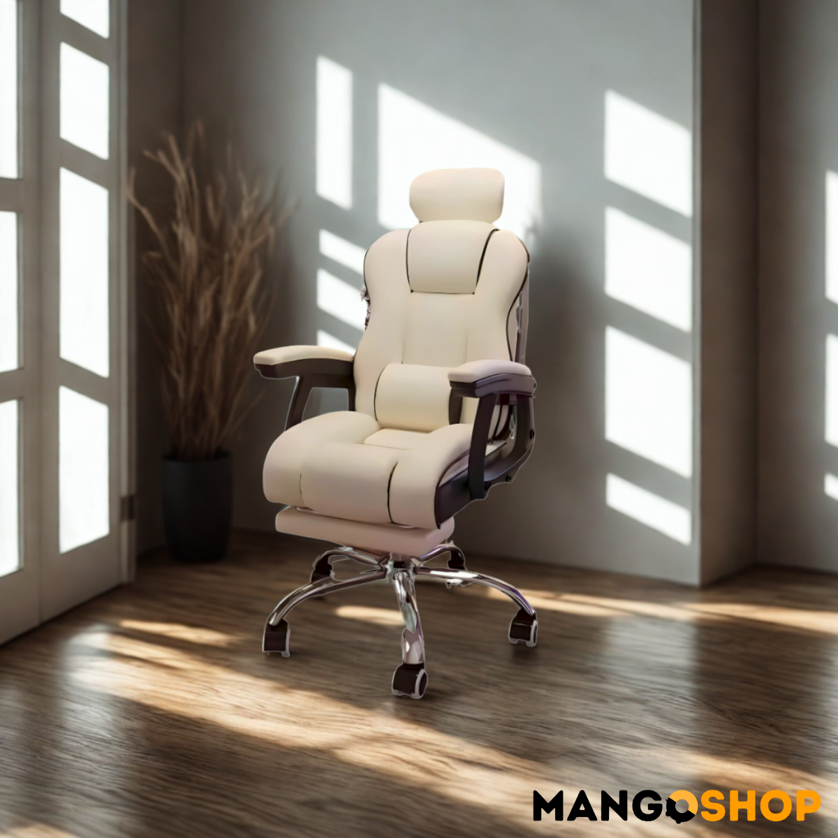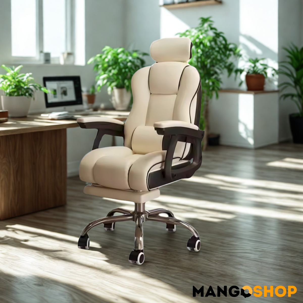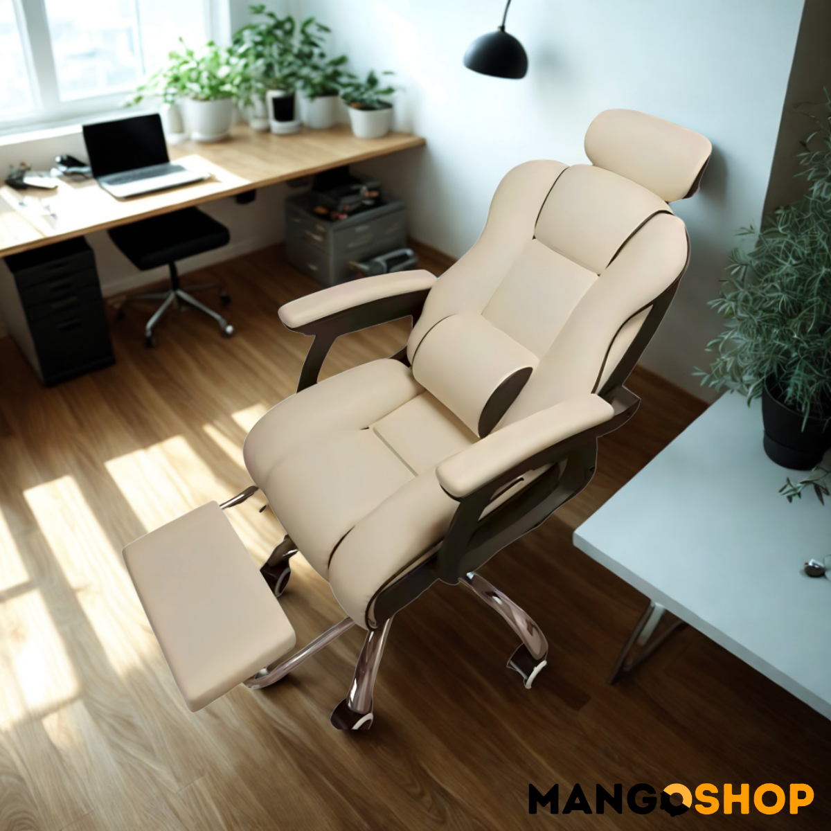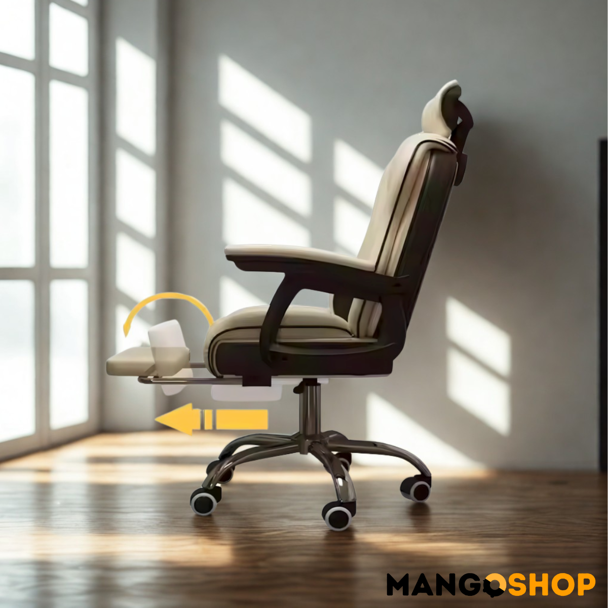 Fotelja je opremljena ugrađenim osloncem za noge, koji se lako izvlači, omogućavajući vam da se opustite i podignete noge tokom pauza. Nagib naslona do 135° omogućava vam da lako pronađete idealan položaj za rad ili odmor, a rotacija od 360° i glatki točkići omogućavaju nesmetano kretanje po prostoriji.