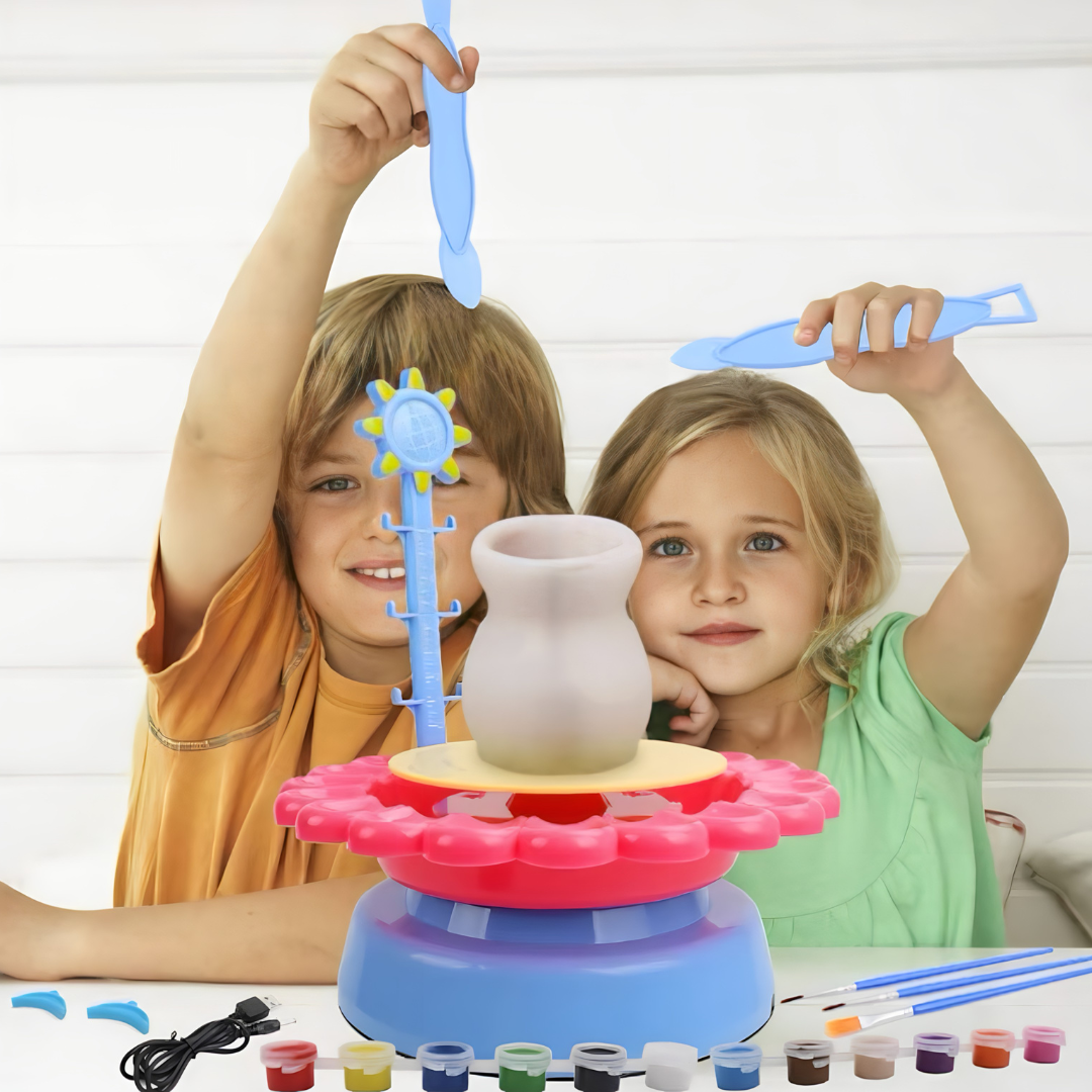 Komplet uključuje električni točak, alatke za oblikovanje, glinu za decu, četkice i boje. Sve što je potrebno nalazi se već u kutiji. Dete može odmah da započne igru – bez čekanja i dodatne kupovine.