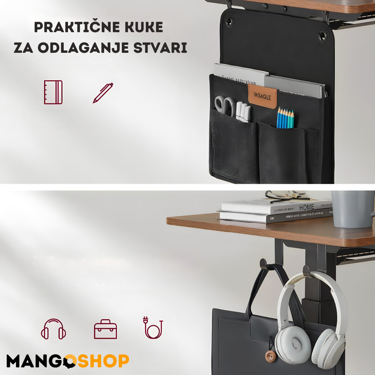 Pored ergonomskih prednosti, sto je opremljen praktičnim USB priključkom za punjenje uređaja, što dodatno olakšava organizaciju radnog prostora. Bočni nosači i kuke omogućavaju kačenje torbi, slušalica ili drugih sitnica, što ovaj sto čini idealnim za kancelariju, kućni radni prostor, pa čak i kreativne studije.