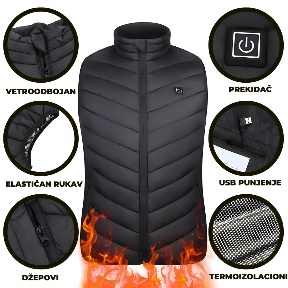 - Ima sopstveni izvor toplote: Prsluk ima grejne panele postavljene tamo gde su najpotrebniji, pružajući toplinu celom telu.