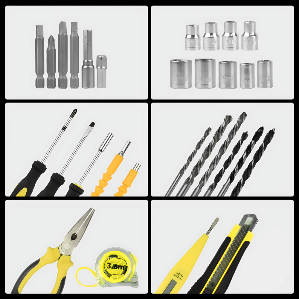 Pored bušilice, set sadrži razne alate kao što su odvijači, klešta, nasadni ključevi i merni alat, čime pokriva širok spektar zadataka. Bez obzira da li radite na jednostavnom šrafljenju, sečenju žica, zatezanju vijaka ili merenju tačnih dimenzija, ovaj set će vam pružiti sve potrebne alate na dohvat ruke.