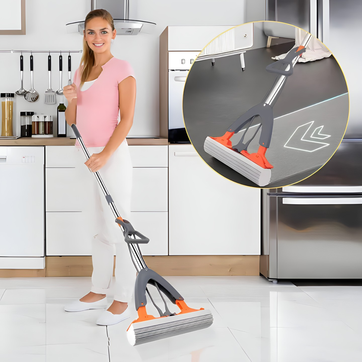 Ne brinite! Želimo da vam predstavimo rešenje koje će čišćenje učiniti skoro pa zadovoljstvom a vašu kožu sačuvati veoma nežnom. Sklopivi mop za beskontaktno ceđenje pruža vam savršeno čist prostor bez muke i uz podove koji će zasijati u trenu!