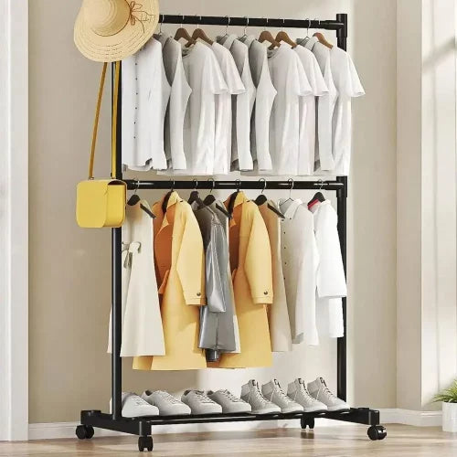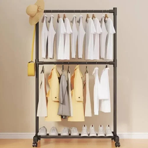 Horizontalna šipka u sredini se može pomerati, omogućavajući podešavanje visine prema vašim potrebama. Sa četiri točka koji rotiraju za 360°, stalak je lako pokretan i može se postaviti bilo gde, dok kočnice osiguravaju stabilnost na željenom mestu. Donja rešetkasta polica pruža dodatni prostor za odlaganje cipela, kutija ili drugih predmeta, a dodatne kuke sa obe strane omogućavaju kačenje torbi, šešira i šalova.