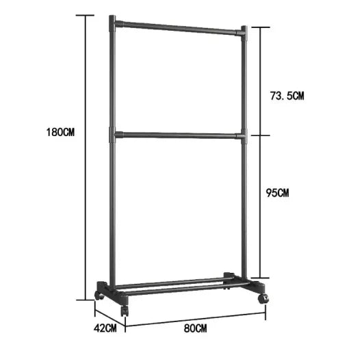 Ovaj stalak za garderobu 180x80cm, dostupan u crnoj i beloj boji, pruža maksimalnu funkcionalnost i organizaciju za vašu odeću. Podesiva gornja šipka se može prilagoditi od 80cm do 120cm, omogućavajući vam da kačite više komada odeće, dok ugrađeni zaustavljači na obe strane sprečavaju padanje. Sa dvostrukim dizajnom, ovaj stalak omogućava bolje organizovanje pantalona, košulja i drugih odevnih predmeta, čineći prostor urednijim.