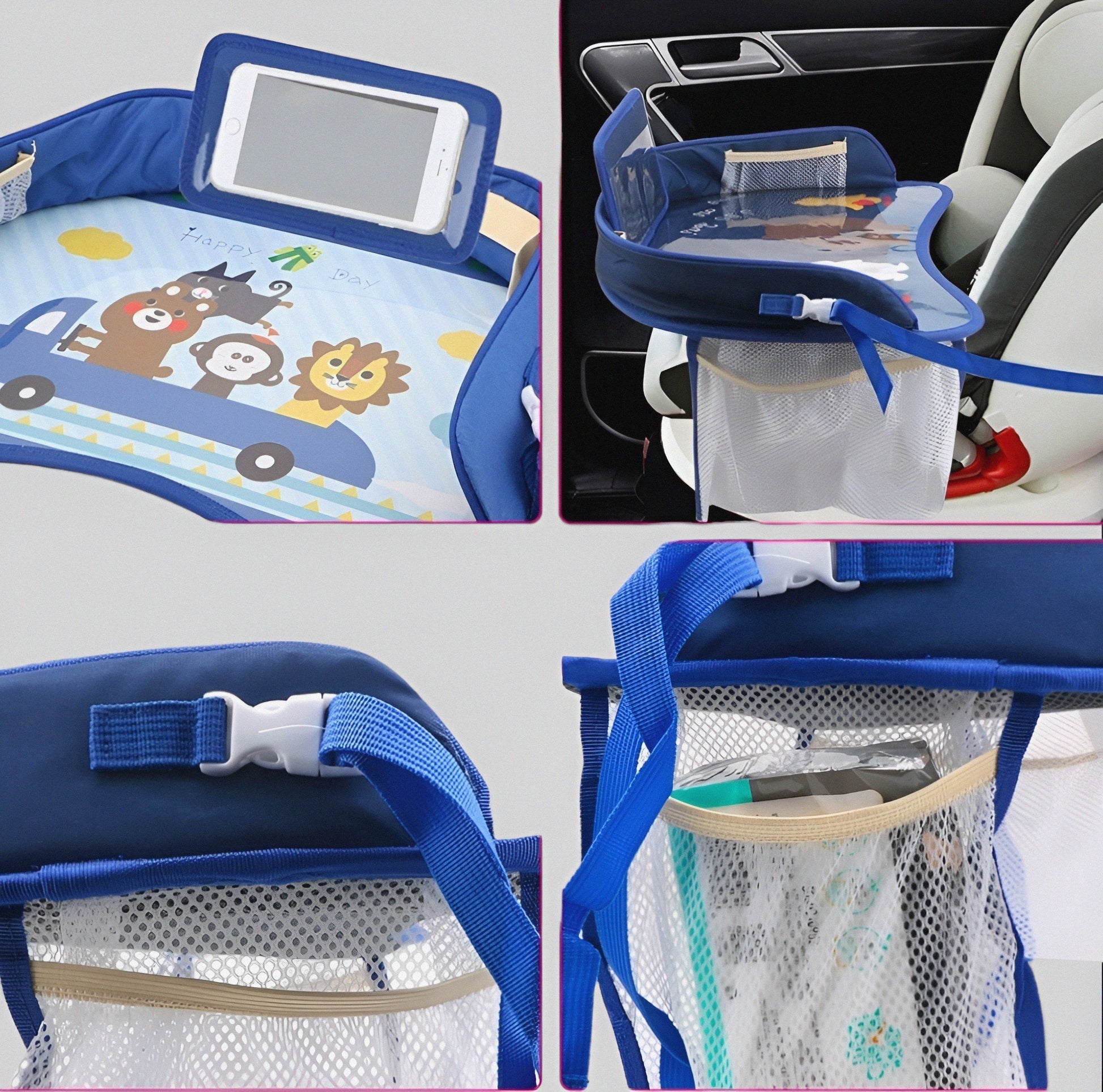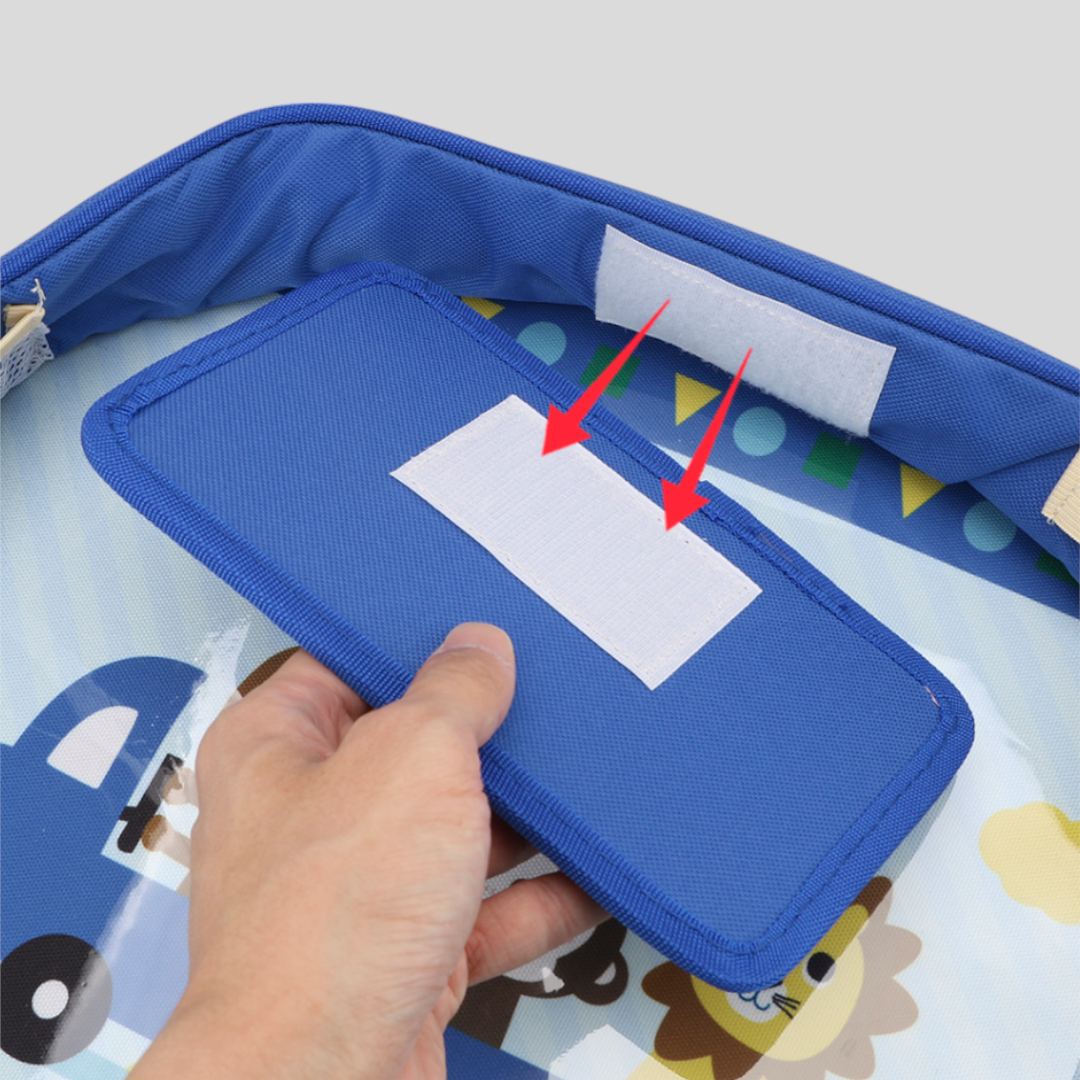 Kaišem se vezuje za auto sedište dok sam stočić stoji u krilu.