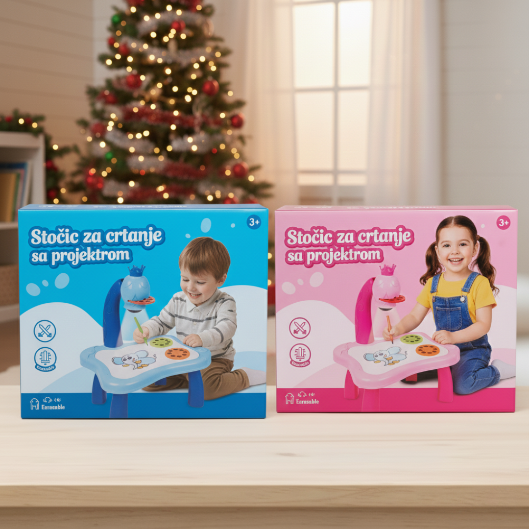 Stočić za crtanje sa projektorom pomaže deci da bez muke naprave „prave“ crteže – ubace slajd, upale projektor i samo prate linije na papiru. Crtanje tako postaje zabavna igra, a ne frustracija, pa se rado vraćaju bojicama umesto da brzo odustanu.