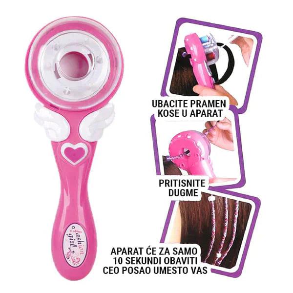 U samo par jednostavnih koraka napravite savršene kikice Vašoj ćerkici! Potrebno je samo da pramen kose prođe kroz aparat i to je to! Zahvaljujući rotaciji od 360 stepeni, svaka kikica će biti precizno ispletena i izgledati savršeno. Gumene spirale se lagano obmotavaju duž pramena kose dajući mu jedinstveni i interesantni završni izgled.